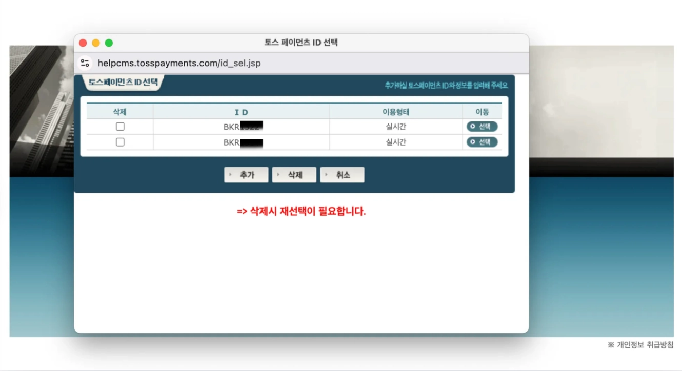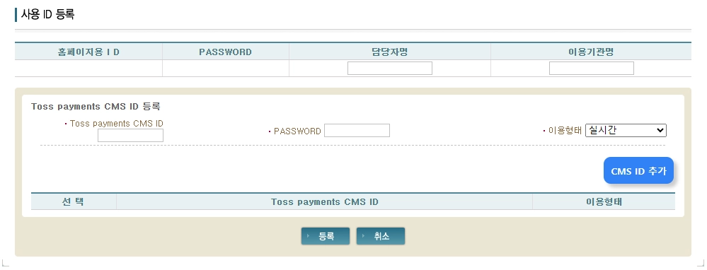 회원 가입 후 사용ID를 처음 등록하는 경우, 해당 화면에서 담당자명, 이용기관명 입력 후 TossPayments 의 CMS ID를 등록해주세요. 등록 시 비밀번호는 '1111' 또는 고객사의 유선번호 뒤 4자리입니다.