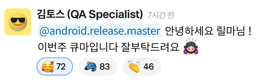 QA 팀원 5명 모두가 매주 돌아가며 QA Master가 되어, 그 주 릴리즈 QA의 모든 DRI (Directly Responsible Individual / 최종의사결정권자)를 가집니다.