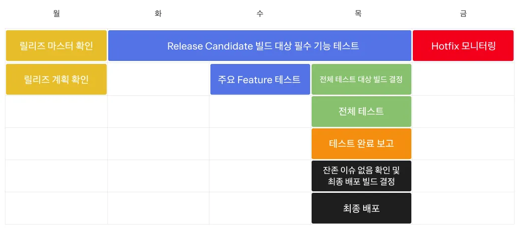 전체 테스트를 수행할 Release Candidate 빌드를 릴리즈 마스터와 함께 결정합니다.